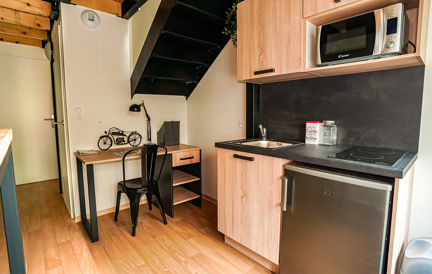 - d’une cuisine équipée comprenant un frigo, une plaque vitrocéramique, un micro-ondes, des rangements, un kit vaisselle et un kit ménage.
